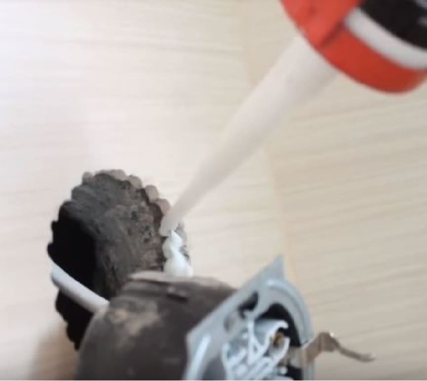 1 способ: подрозетник вклеиваем в отверстие с помощью монтажного акрилового универсального клея. Даем ему высохнуть.